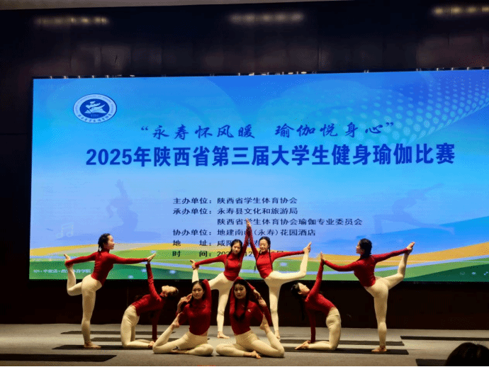 2025 年 12 月 8—9 日,由陕西省学生体育协会主办的陕西第三届大学生健身瑜伽比赛在永寿县地建南山花园酒店举行。本次比赛共吸引来自全省数十所高校的代表队同台竞技。我校瑜伽代表队参加本次比赛的6个竞赛项目中,荣获第四名3项,第六名1项。教练员蒋坤以及参赛运动员们积极备战,以舒展的体式、流畅的衔接与专注的神情,将健身瑜伽“内修外炼”的理念演绎得淋漓尽致,为观众呈现了一场力与美交融的视觉盛宴。